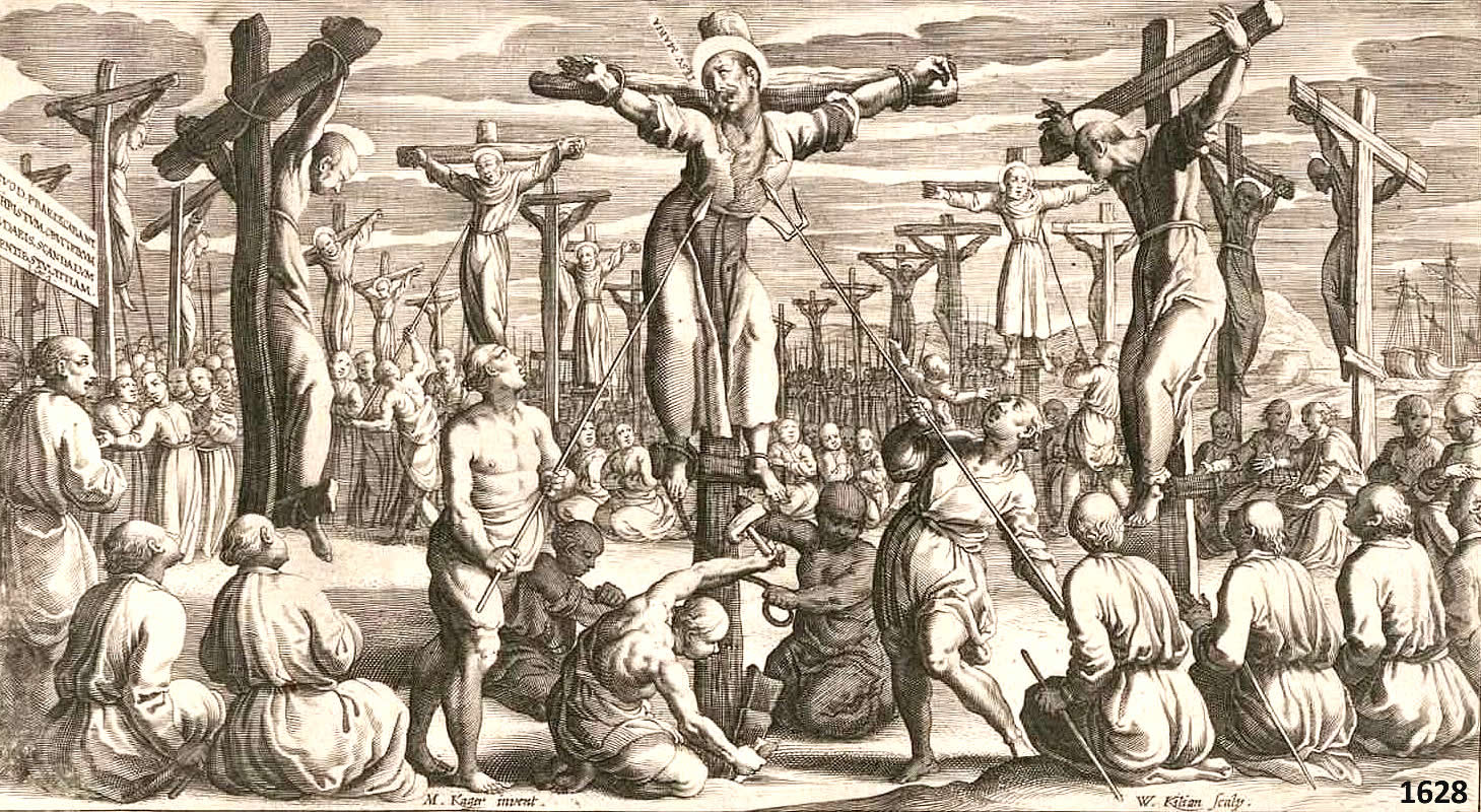 The “26 Martyrs of Japan” were crucified on February 5, 1597. In 1543 the first Christian missionaries arrived in Japan—Portuguese Catholics. With a few decades the religion was thriving in Japan, with hundreds of thousands of converts. Fearful of the growing influence of the faith, and of the perception that Christians placed loyalty to Christ above loyalty to the Shogunate, in 1587 Shogun Toyotomi Hideyoshi banned propagation of Christianity, declaring that Shintoism and Buddhism were the only permissible religions in Japan. Enforcement of the degree was lackadaisical, however, and Christian missionaries continued to arrive and were generally tolerated—until an incident in 1596 sparked severe persecution. In late 1596 the Spanish ship San Felipe was shipwrecked on the coast of Japan, carrying a cargo worth over a million pesos. When the local Japanese authorities began confiscating the ship’s cargo, the Spanish captain protested and the matter was sent to Hideyoshi for resolution, in the capital city of Kyoto. While the negotiations were ongoing, one of the Japanese commissioners, Mashita Nagamori, befriended some of the Spanish crew. When he asked one of the ship’s officers to tell him more about his country, the officer pulled out a map of the world and proudly showed Nagamori the extent of the Spanish empire. He also insinuated that the way Spain grew its empire was by first infiltrating foreign populations and converting them to Christianity, then later conquering them. Nagamori reported the conversation to Hideyoshi, who interpreted it as confirmation of his fear that Christian missionaries were part of plot to take over his country. He immediately ordered that the immediate arrest of Christian leaders in Kyoto. Twenty-six Christians—four Spaniards, one Mexican, one Portuguese Indian, and twenty Japanese, were arrested. To intimidate the Christian population, the arrested men were forced to march from Kyoto to Nagasaki (600 miles). Once there, all twenty-six were tortured and crucified. They were killed with lances while hanging on their crosses. Following the “San Felipe Incident” and the execution of the missionaries, all Christian churches in Japan were destroyed, and practice of the Christian faith was made punishable by death. For centuries, suspected Christians were required to step on an image of Christ or the Virgin Mary (something the Japanese authorities believed no believer would do). Over the next 250 years, hundreds more Christians and missionaries were tortured and executed in Japan, many of whom were subsequently canonized. The persecution of the Church finally ended with the Meiji Restoration in 1868. During the time that Christianity was illegal and Christians were being persecuted, the faith survived in Japan, being kept alive by Kakure Kirishitan, “Hidden Christians.” When the persecution ended, over 20,000 “Hidden Christians” revealed themselves. In 1862 the “26 Martyrs of Japan” were canonized by Pope Pius IX. In Nagasaki today there is a Twenty-Six Martyrs Museum and Monument, erected in 1962. |