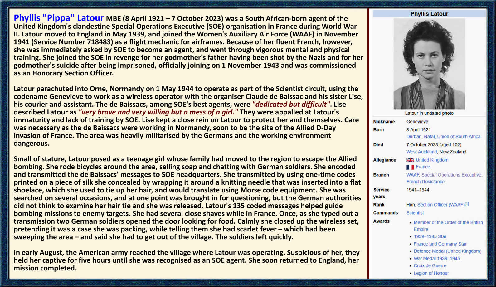 | The male agents kept dying in the shadows, so British intelligence disguised a 23-year-old woman as a village girl, trained her to kill, and dropped her into Nazi-occupied France — where she outwitted the Third Reich for 135 days. May 1, 1944 - five days before D-Day would crack open Nazi Europe, a dark bomber sliced through the sky over Normandy. At its open door stood Phyllis Latour — tiny, calm, and impossibly brave, staring at occupied France thousands of feet below her: no rifle, no platoon - just a parachute, a cover story, and a battered bicycle waiting to become her execution — or her legend. She was 23, and the Nazis had already eliminated every male spy sent in her place. Churchill’s Special Operations Executive needed someone invisible, someone the Gestapo would dismiss before they feared. They needed a ghost dressed as a child; they chose her. She had trained until her knuckles split on cold stone, practrised Morse code until her fingertips bled - silent killing, disappearing, climbing walls with a cat burglar, resisting torture. This wasn’t duty: this was vengeance — the Nazis had murdered her godfather, then she jumped into the darkness. She buried her British gear, brushed her hair into a little girl’s ribbon — codes hidden inside — and pedaled into occupied towns selling soap, giggling like someone too innocent to fear war. “The men before me were caught and killed,” she later murmured, calm as a winter lake. “I would be less suspicious.” For 135 days, that “harmless peasant girl” memorized troops, tanks, bunkers, fuel lines. Then she vanished into forests to send lifelines to London at a speed most wireless operators never reached. She never transmitted twice from the same place. If she did, a German detection truck would find her, torture her, erase her. So she slept in barns, fields, empty rooms — hunger and death whispering beside her. Once, soldiers stopped her, searched everything. A Nazi officer reached for her ribbon — the one hiding silk codes.