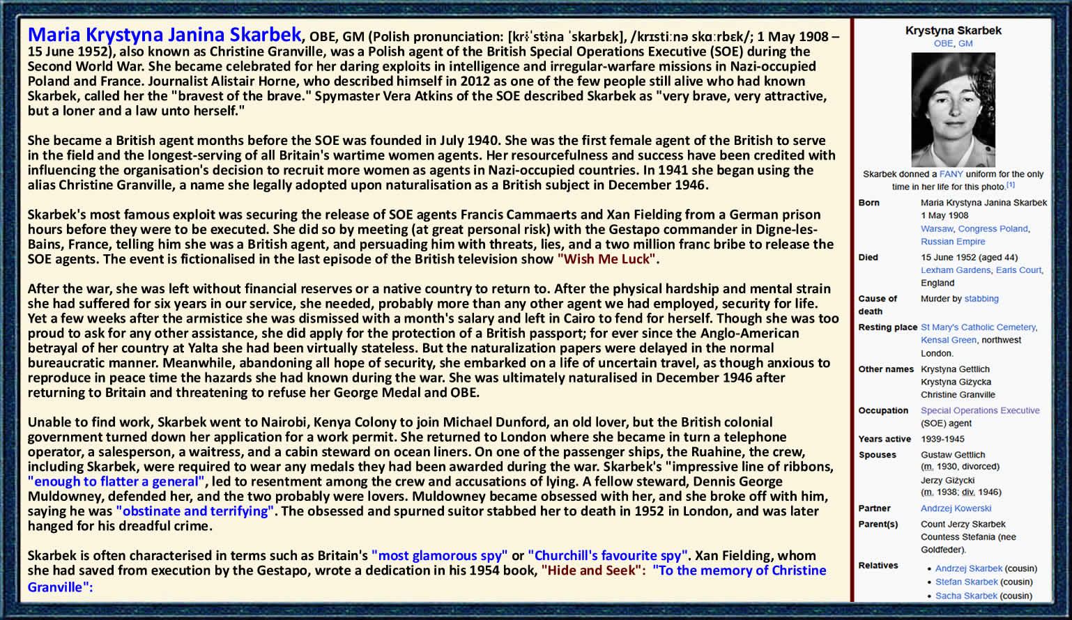 When word of the arrests reached Krystyna Skarbek, she did something no one else would have dared. She didn’t try to plan an escape or call for help. She walked straight into Gestapo headquarters. She asked to see the commanding officer, and when he appeared, she calmly delivered an astonishing story. She claimed she was the niece of Field Marshal Bernard Montgomery, one of the most famous Allied commanders. She told him the war was effectively over, that Allied forces would reach the town within hours, and that any officer who executed Allied agents at this stage would be tracked down and prosecuted as a war criminal. Then she offered him another possibility. Officers who showed restraint, who released prisoners instead of killing them, might be treated leniently when the Allies arrived. She left him with a simple choice: carry out the executions and guarantee his own punishment, or release the prisoners and possibly save himself. None of it was true. She had no connection to Montgomery, no official authority, and no backup waiting outside. What she had was perfect timing, total nerve, and a clear understanding of fear. The war was turning, the Germans were retreating, and everyone knew it. Along with a substantial bribe, her bluff worked. Whether the officer truly believed her or simply decided not to gamble his future, the result was the same. Just hours before they were due to die, all three prisoners were released. Krystyna Skarbek had talked condemned men out of a Gestapo prison by understanding that, in a collapsing occupation, fear could be more powerful than any weapon. By then, this kind of impossible success was almost routine for her. She had been doing work like this since the beginning of the war. She was born in Poland in 1908 into an aristocratic family and grew up multilingual, athletic, and fiercely independent. When Germany invaded Poland in 1939, she happened to be in Britain. She could have stayed there in safety, watching the war from exile. Instead, she walked into British intelligence offices and volunteered. She became one of the first female agents of the Special Operations Executive, the secret organization created to run sabotage and espionage behind enemy lines. Under the cover name Christine Granville, she spent the next five years moving through occupied Europe. She skied across mountain borders carrying microfilm. She smuggled people out of occupied Poland. She organized resistance networks and sabotage missions, often with little support and enormous personal risk. In 1941, she was arrested by the Gestapo in Hungary. Interrogation and execution seemed inevitable. To escape, she bit her own tongue until it bled badly, then pretended to be suffering from advanced tuberculosis. Terrified of contagion, the Gestapo released her rather than risk an outbreak. She walked out of custody and went straight back to intelligence work. After D-Day, she was parachuted into France to coordinate resistance groups and pass intelligence to advancing Allied forces. The Gestapo placed a bounty on her head. Nazi officials across the region wanted her captured. Time and again, she slipped away—until the day she chose not to run at all, and instead walked directly into their headquarters and forced them to release her colleagues. By the end of the war, she had received the George Medal, the Order of the British Empire, and the Croix de guerre. She was one of Britain’s most decorated female agents. She had saved countless lives and carried out missions that genuinely helped shorten the war. And then the war ended, and Britain largely forgot her. When the SOE was dissolved in 1946, its agents were dismissed with minimal support. Krystyna, now effectively stateless because Poland was under Soviet control, was given £100 and told to rebuild her life on her own. The woman who had risked everything for the Allied cause ended up working as a shop assistant, then as a stewardess on passenger ships. She struggled to afford rent in London and lived quietly, far from the world where her courage had once mattered. During this time, she met Ian Fleming, a former naval intelligence officer who would later create James Bond. He was fascinated by her. The strong, capable women in his novels, especially Vesper Lynd in Casino Royale, were influenced by Krystyna. The difference was that in real life, she had never been a side character or a romantic accessory. She had been the decision-maker, the survivor, the one who acted. Her story ended not with recognition, but with tragedy. On June 15, 1952, in the lobby of the Shelbourne Hotel in London where she was living, a merchant seaman named Dennis Muldowney confronted her. He had become obsessed with her and could not accept her rejection. He stabbed her in the chest. She died almost immediately. The woman who had survived the Gestapo, Nazi occupation, and years of war was killed in peacetime by a man who could not accept her independence. Only a small group of former colleagues attended her funeral. There were no official representatives, no military honors, and no public recognition of what she had done. For decades, her name faded from memory. Slowly, historians pieced her story back together. Books were written; documentaries followed. Today, her rescue of Francis Cammaerts is studied as a classic example of psychological warfare, and her career is recognized as proof that creativity, intelligence, and nerve can defeat overwhelming odds. Krystyna Skarbek walked into Gestapo headquarters and talked three men to freedom. She escaped captivity by sheer ingenuity. She spent five years behind enemy lines. She inspired some of fiction’s most famous spy characters, while living a far more dangerous life than any novel could capture. She was born in Poland in 1908 and murdered in London in 1952. Between those dates, she lived a life of extraordinary courage, saved lives, and never asked permission to be brave. Britain forgot her. History did no