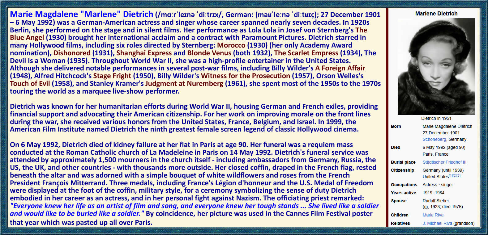 But Dietrich's war work extended beyond the stage. In 1943, the Office of Strategic Services - the precursor to the CIA - approached her to participate in a secret propaganda project. She recorded American songs in German, including "Lili Marlene", which became beloved by soldiers on both sides of the conflict. The Nazi leadership tried to ban her music, but German soldiers on the front petitioned to have it reinstated. A U.S. Strategic Bombing Survey later concluded that her broadcasts were "just as devastating to German morale as an air raid." Behind the scenes, she did even more. In the late 1930s, before the war even began, she had created a fund with filmmaker Billy Wilder to help Jews escape Nazi Germany. She donated her entire salary from the 1937 film Knight Without Armour - $450,000 - to help refugees. She housed German and French exiles in her own home, provided them financial support, and advocated for their American citizenship. She was, in every sense, a woman at war.
