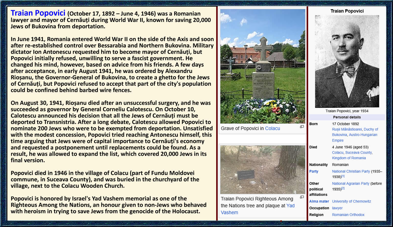 | Traian Popovici was born on October 17, 1892, in Ru?ii Manastioara, Romania. He became a lawyer and entered public service, eventually becoming mayor of Cernau?i (Czernowitz, now Chernivtsi in Ukraine) in October 1941. Cernau?i was a major city in Romanian Bukovina with a large, prosperous Jewish community of approximately 50,000 people before the war - about half the city's population.
