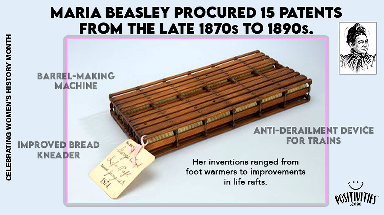 | Maria Beasley - c. 1836–1913): At 44, she put down her needle and thread, picked up a wrench - and became one of America's richest female inventors, earning more in a year than most women made in a decade.