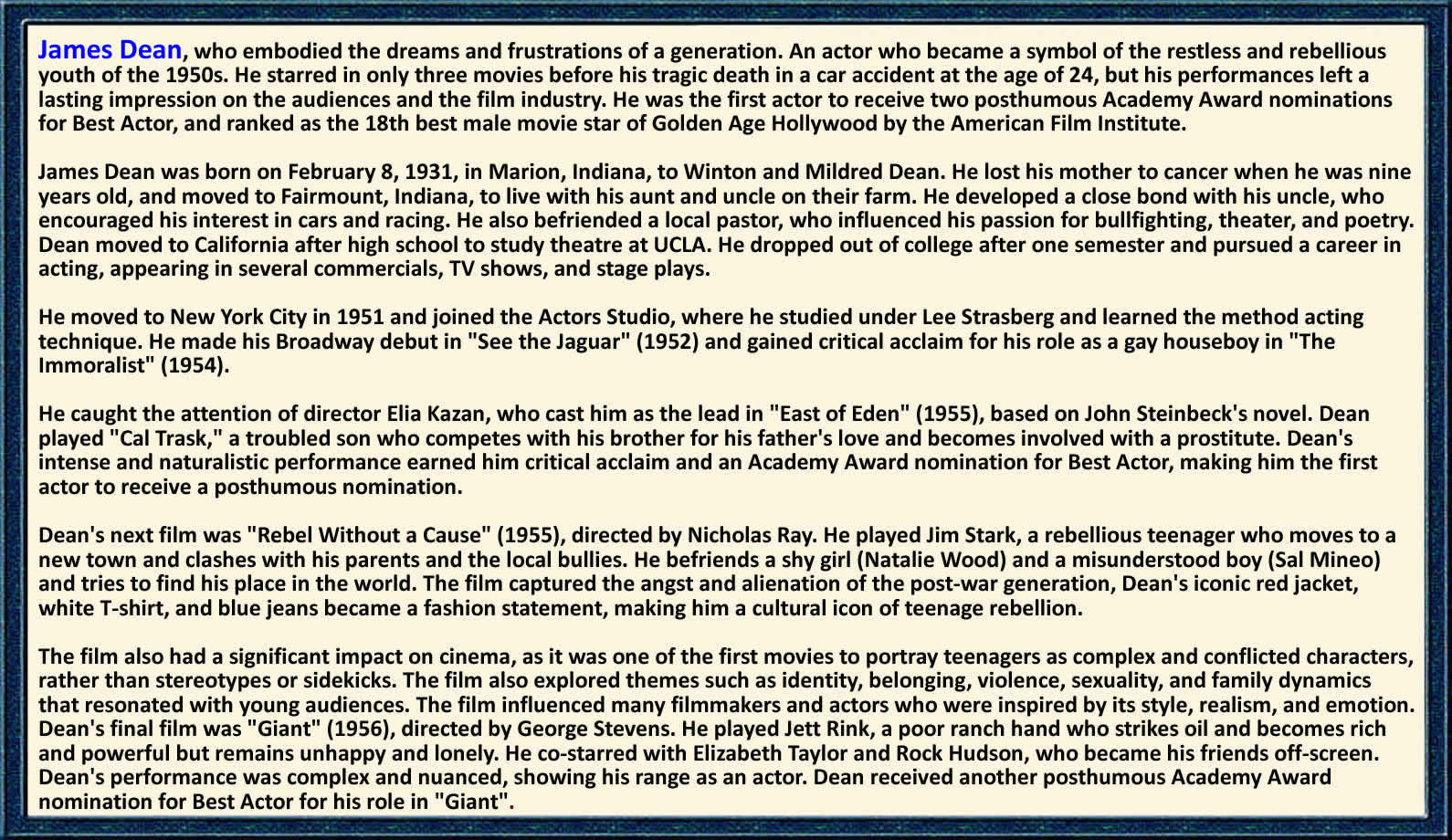 Elia Kazan, in his autobiography "A Life" said that he was grateful to have Harris on the set of "East of Eden" because she had a calming influence on James Dean. Kazan praised Harris as both an actress and as a human being. Harris reciprocated, saying that she found Kazan easy to work with and very stimulating: "He adored actors because he was an actor. He was exciting to be with and got everyone excited about what they were doing." (IMDb)