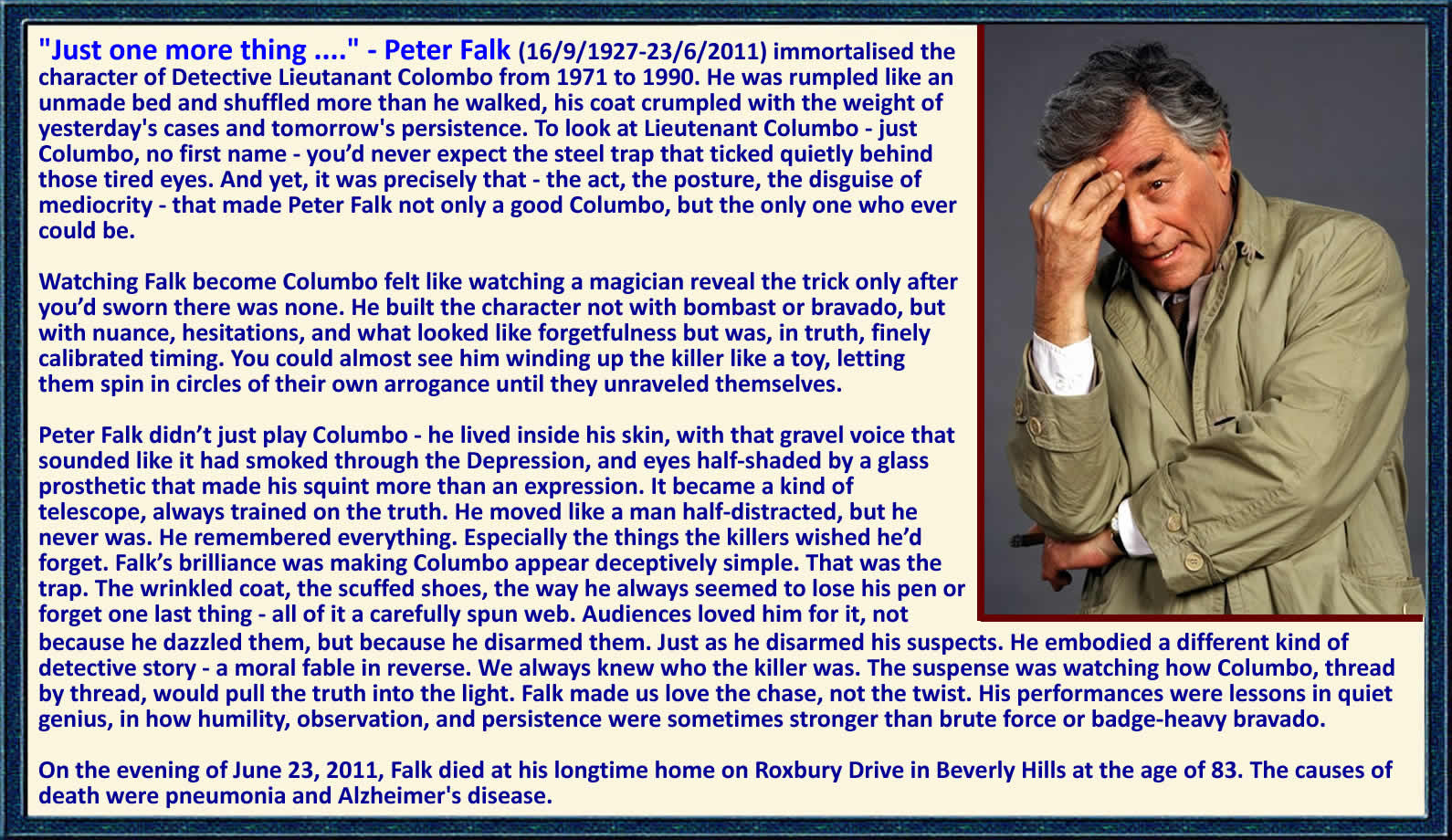 | Peter Falk walked into the cramped New York studio on February 15, 1968, carrying nothing but a tattered script for "Columbo" and a cast iron resolve that would define his life. Everyone expected another struggling character actor in a sea of faces, but Falk had already endured polio as a child, a failed marriage, and years of auditions that ended in polite rejections. His brown eyes, one glass from a childhood surgery, betrayed a stubborn intelligence, and he refused to let the industry’s labels dictate his worth. Falk’s first meeting with creator Richard Levinson was tense. “We don’t want a conventional detective,” Levinson said. The network wanted a polished hero, smooth and unshakable. Falk, who had studied under the Method but preferred improvisation, insisted: “If you want him real, you have to let him be flawed. Let him stumble. Let him hum while solving it.” It was a gamble. The pilot’s budget was $125,000, tight enough that Falk’s own raincoat - battered and gray - became part of the character’s signature. During filming, Falk improvised constantly. On set at Stage 8, Universal Studios, he stuffed his trench coat pockets with fake cigarettes and used them as props, a small gesture that became a hallmark of Columbo’s nervous energy. When a camera angle failed to capture a nuance, Falk repeated the line until subtle hesitations appeared, creating a rhythm that made audiences feel as though the detective was thinking aloud. Fellow actor Jack Cassidy recalled, “He could disappear inside a scene and make you forget he was acting. That was Peter.” The risk was immense. Networks called him eccentric; studio executives grumbled about “that scruffy little man” who refused conventional charm. Falk was paid $7,500 per episode while CBS’s star leads earned upwards of $35,000. He could have conformed, taken cosmetic changes, smoothed his voice, and walked a safer path - but he refused. He walked out of fittings that tried to erase Columbo’s quirks. He turned down scripts that wanted him glamorous instead of authentic. His rebellion was quiet, but it saved the show from mediocrity. Falk’s insistence on authenticity created moments audiences never anticipated. In “M**der by the Book,” he spent two full takes pacing around a suspect, adjusting his tie nervously, muttering a half-forgotten line of Shakespeare to himself. Camera operators whispered about the genius unfolding. Nielsen ratings exploded - "Columbo" became a cultural touchstone without ever flaunting his intellect. Even behind the camera, Falk mentored young actors. At a rehearsal on October 12, 1973, he advised a nervous guest star: “Don’t play them; let them play themselves. That’s where the truth lives.” His guidance shaped careers quietly, a ripple effect unseen by viewers but monumental to those who worked with him. "Columbo" ran for decades, and Falk remained fiercely protective of its integrity. He refused lucrative spin-offs that diluted the character, refused cosmetic surgery to match Hollywood ideals, and turned down $500,000 offers to appear in projects that compromised his principles. By 1995, when production slowed, critics reflected on his quiet revolution: an actor who made imperfection magnetic, intelligence intimate, and humanity central. Peter Falk wasn’t just a detective on screen. He was a mentor to actors, a hidden rebel against studio conformity, and a master of subtlety. His trench coat, cigarette, and hesitant cadence weren’t affectations - they were declarations of authenticity in an industry that rewarded gloss over grit. “If you can see the humanity,” he once said, “the rest will follow.” |