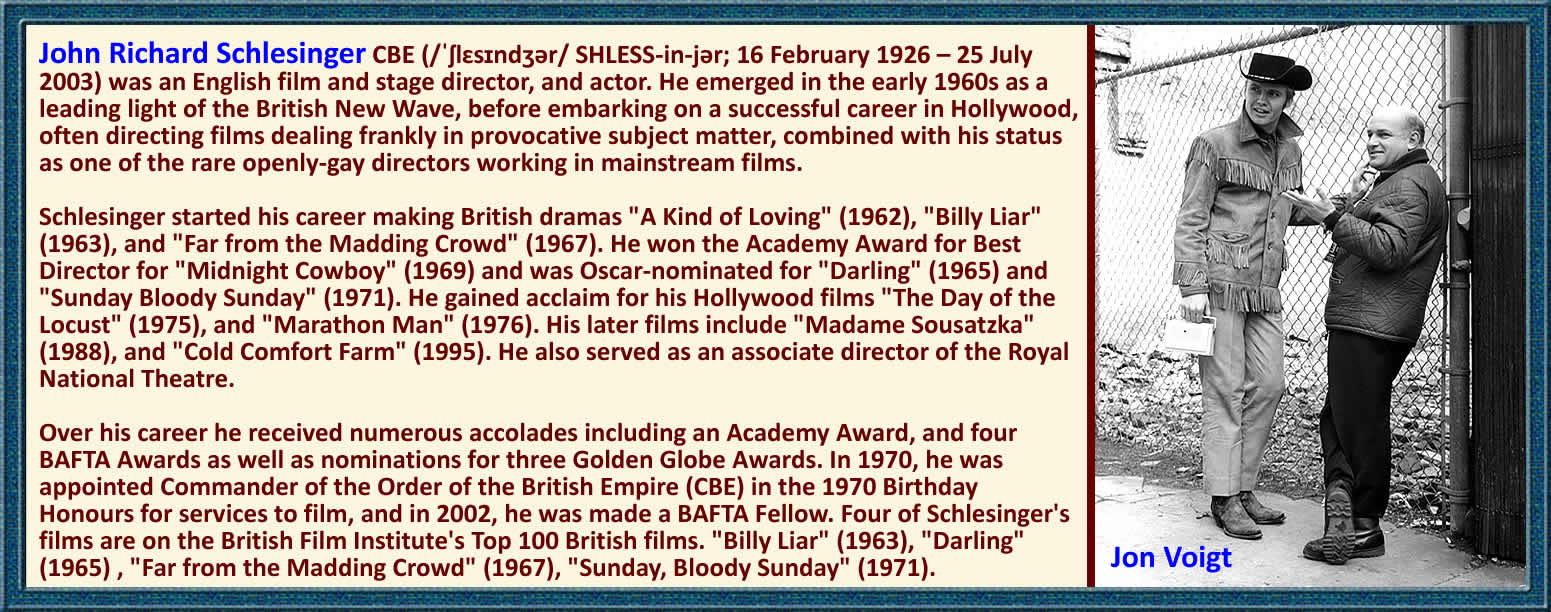 Schlesinger started his career making British dramas A Kind of Loving (1962), Billy Liar (1963), and Far from the Madding Crowd (1967). He won the Academy Award for Best Director for Midnight Cowboy (1969) and was Oscar-nominated for Darling (1965) and Sunday Bloody Sunday (1971). He gained acclaim for his Hollywood films The Day of the Locust (1975), and Marathon Man (1976). His later films include Madame Sousatzka (1988), and Cold Comfort Farm (1995). He also served as an associate director of the Royal National Theatre.