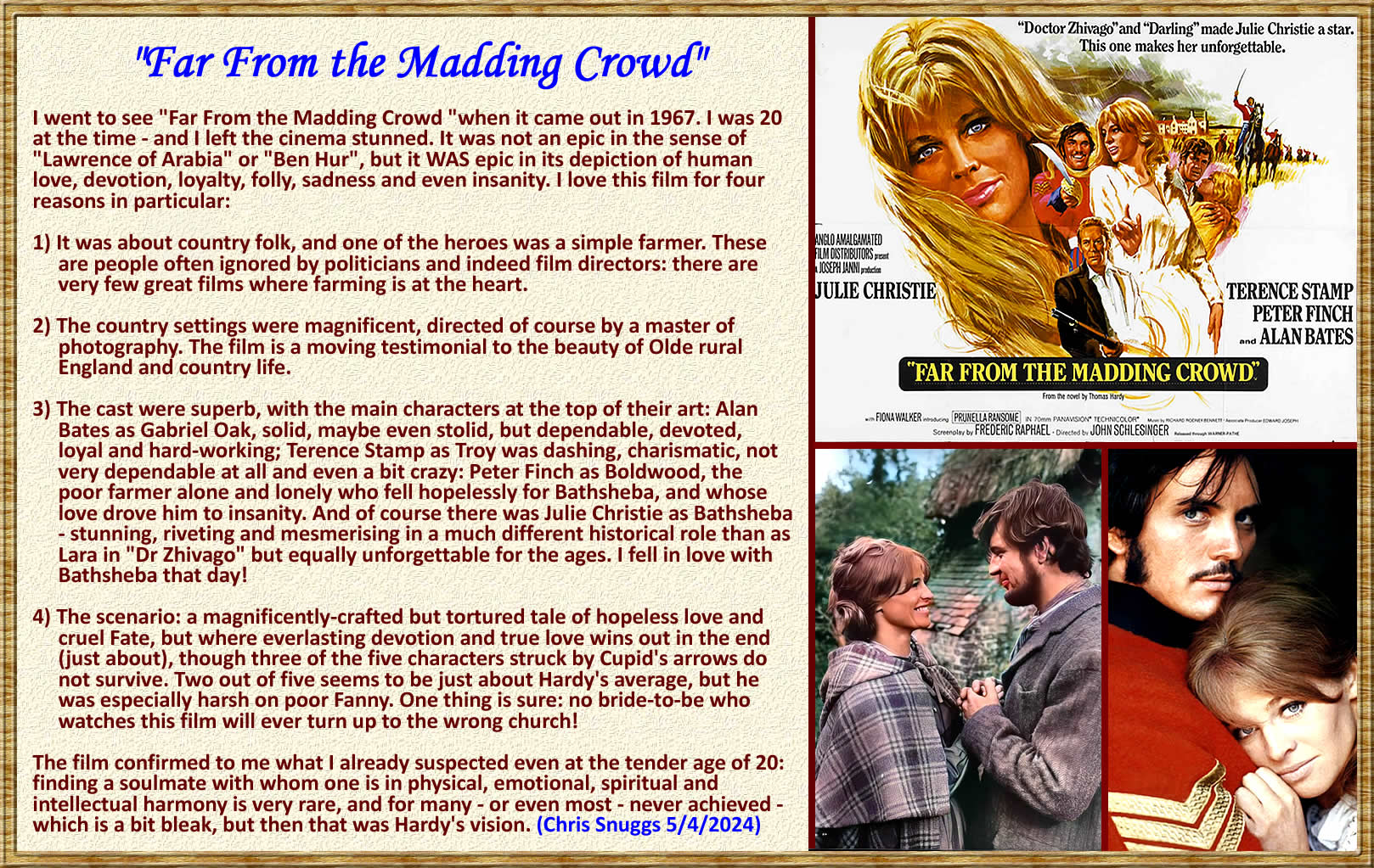 I watched "Far From the Madding Crowd" yesterday for the first time in many years and was once again moved and stunned. The setting, the music, the stories and the cast are all a masterpiece. Julie as Bathsheba we know, stunningly lovely, feisty, mischevious - and smart, but even so too slow to see that Gabriel is the one, so easily led astray by the dashing but shallow Sergeant, who was so cruel to poor Fanny. Peter Finch as Boldwood was never better, and the way he is shown falling in love at first sight with Bathsheba is beautifully done. Her calling out of the grain sellers in the market and then her singing (and Gabriel's playing for her was very significant) just enraptured him beyond saving. And Oak? Hardy did not name him so for nothing; was there ever a more solid, loyal, steadfast and honorable man portrayed on screen? When he lost his sheep - a total catastrophe - his first thought was: "Thank goodness I am not married." He accepted so gracefully Bathsheba's first rejection, and just carried on. Later - though still in love wlth her - he was not afraid to tell her how wrong she had been to send the Valentine Card, and she fired him - impetuous and unrealising what a treasure she had before her. But then in her own sheep disaster she wrote him a beautiful note from the heart she seems unable to admit to: "Please do not desert me." And of course he could not. But then he had to watch and wait long years in patience as she dallied with Boldwood and was seduced by the shallow peacock Sergeant Troy - until finally at the end she and Gabriel come together - and she would never find a more loving, loyal, devoted, hard-working man. Alan Bates deserved an Oscar for his utterly moving performance. He perfectly played a role-model for the ages. Thank you, too, John Schlesinger. I will always love you for giving us this masterpiece of Humanity. |