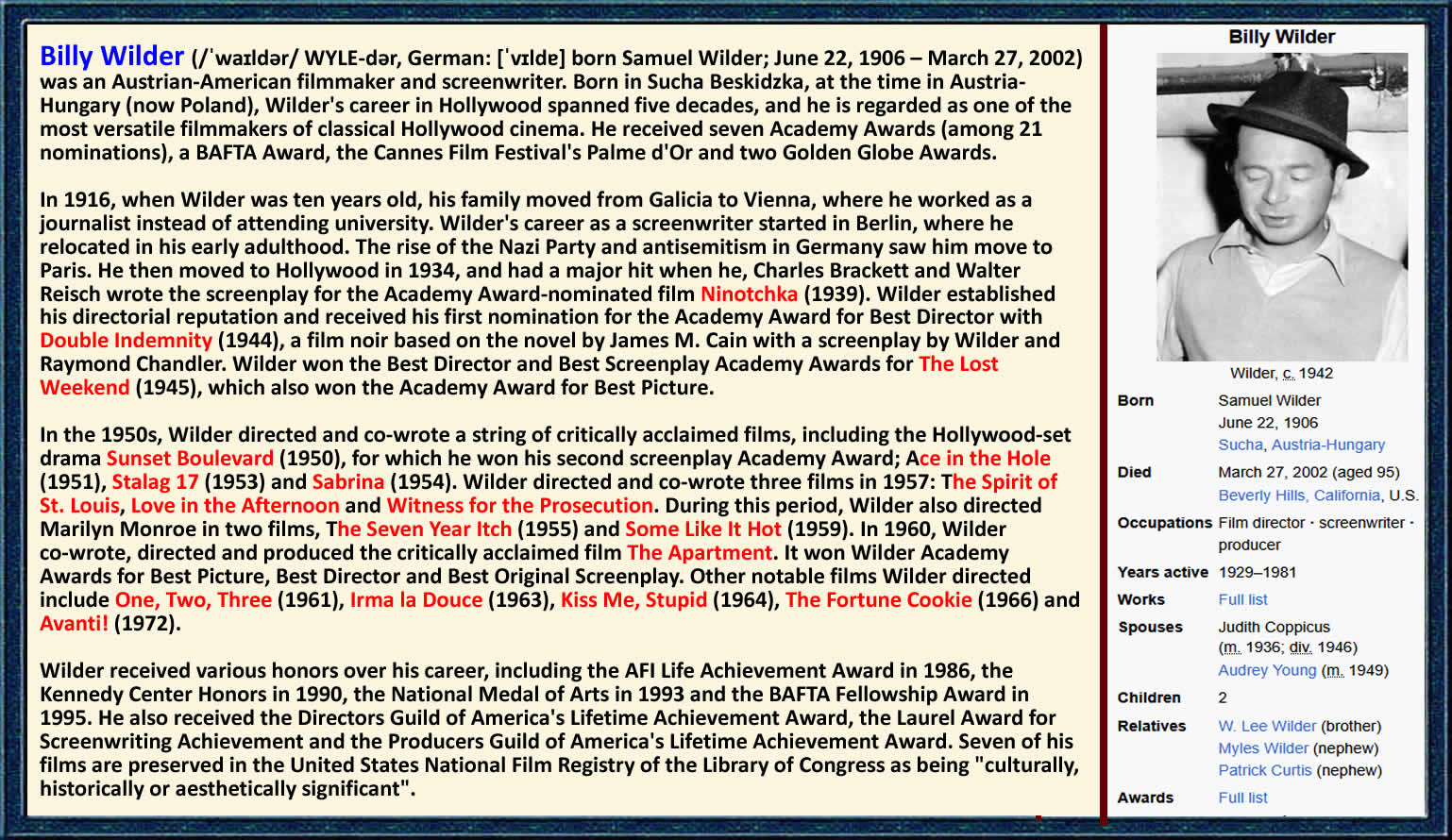 In 2002 , the world lost one of the greatest filmmakers who ever lived, but his real story began long before Hollywood. His name was Billy Wilder. Born Samuel Wilder on June 22, 1906, in a small town in what is now Poland, he grew up Jewish in a world that was about to turn against him. His mother nicknamed him Billy — after Buffalo Bill Cody, the American frontier hero she adored. She had no idea how prophetic that name would become. Billy moved to Vienna, then to Berlin, where he built a career as a screenwriter — witty, sharp, unstoppable. He was going places. Then on February 28, 1933, the Reichstag burned. The day after, Billy Wilder packed a single bag and left Germany. He knew what was coming. He left his mother behind. He left his stepfather behind. He left his grandmother behind. He told them to follow. They didn't. Billy made it to Paris. Then to America. He arrived in Hollywood with eleven dollars in his pocket, speaking almost no English, sleeping on friends' floors, sharing a room with fellow exile Peter Lorre. He learned English by listening to the radio. He learned Hollywood by refusing to quit. Within a decade he was directing masterpieces. "Double Indemnity" - "Sunset Boulevard" - "Stalag 17" - "Some Like It Hot" - "The Apartment". Seven Academy Awards: a career that made the whole world laugh — built by a man carrying a grief most people never knew about, because when the war ended and Billy returned to Germany as a US Army colonel, he finally learned the truth: his mother had been murdered in a Nazi labor camp in 1943. His stepfather killed at a death camp in 1942. His grandmother died in a ghetto the same year. He had spent the war making movies in Hollywood while they died. He never forgave himself. When Holocaust deniers attacked him in print, Billy Wilder wrote back in a German newspaper with one sentence: "If the concentration camps and the gas chambers were all imaginary — then please tell me. Where is my mother?" He had wanted his final film to be "Schindler's List" — as a memorial to them. Steven Spielberg made it instead. Billy praised it without reservation. Billy Wilder died on March 27, 2002, aged 95. He came to America with eleven dollars and gave the world "Some Like It Hot". He made us laugh his whole life. He carried his loss every single day of it. |