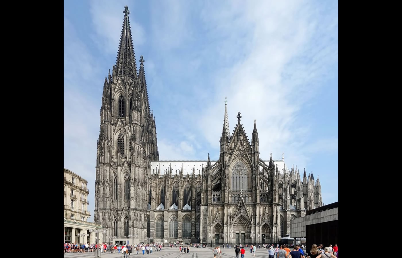 Cologne Cathedral (German: Kölner Dom, officially Hohe Domkirche Sankt Petrus, English: Cathedral Church of Saint Peter) is a Catholic cathedral in Cologne, North Rhine-Westphalia. It is the seat of the Archbishop of Cologne and of the administration of the Archdiocese of Cologne. It is a renowned monument of German Catholicism and Gothic architecture and was declared a World Heritage Site in 1996. It is Germany's most visited landmark, attracting an average of 20,000 people a day. At 157 m (515 ft), the cathedral is the tallest twin-spired church in the world, the second tallest church in Europe after Ulm Minster, and the third tallest church of any kind in the world. It is the largest Gothic church in Northern Europe and has the second-tallest spires. The towers for its two huge spires give the cathedral the largest façade of any church in the world. The choir has the largest height-to-width ratio, 3.6:1, of any medieval church. Construction of Cologne Cathedral began in 1248 but was halted in the years around 1560, unfinished. Attempts to complete the construction began around 1814 but the project was not properly funded until the 1840s. The edifice was completed to its original Medieval plan in 1880. Cologne's medieval builders had planned a grand structure to house the reliquary of the Three Kings and fit for its role as a place of worship for the Holy Roman Emperor. Despite having been left incomplete during the medieval period, Cologne Cathedral eventually became unified as "a masterpiece of exceptional intrinsic value" and "a powerful testimony to the strength and persistence of Christian belief in medieval and modern Europe". Only the telecommunications tower is higher than the cathedral. The cathedral suffered fourteen hits by aerial bombs during World War II. Badly damaged, it nevertheless remained standing in an otherwise completely flattened city. The twin spires were an easily recognizable navigational landmark for Allied aircraft bombing.On 6 March 1945, an area west of the cathedral (Marzellenstrasse/Trankgasse) was the site of intense combat between American tanks of the 3rd Armored Division and a Panther Ausf. A of Panzer brigade 106 Feldherrnhalle. A nearby Panther, a German medium tank, was sitting by a pile of rubble near a train station right by the twin spires of the Cologne Cathedral. The Panther successfully knocked out two Sherman tanks, killing three men, before it was destroyed by a T26E3 Pershing, nicknamed Eagle 7, minutes later. Footage of that battle survives. The destroyed Panther was later put on display at the base of the cathedral for the remainder of the war in Europe. Repairs of the war damage were completed in 1956. A repair to part of the northwest tower, carried out in 1944 using poor-quality brick taken from a nearby ruined building, remained visible as a reminder of the war until 2005, when it was decided to restore the section to its original appearance. To investigate whether the bombings had damaged the foundations of the Dom, archaeological excavations began in 1946 under the leadership of Otto Doppelfeld and were concluded in 1997. One of the most meaningful excavations of churches, they revealed previously unknown details of earlier buildings on the site. Repair and maintenance work is constantly being carried out in one or another section of the building, which is rarely completely free of scaffolding, as wind, rain, and pollution slowly eat away at the stones. The Dombauhütte, established to build the cathedral and keep it in repair, is saidto employ the best stonemasons in the Rhineland. Half the costs of repair and maintenance are still borne by the Dombauverein. |