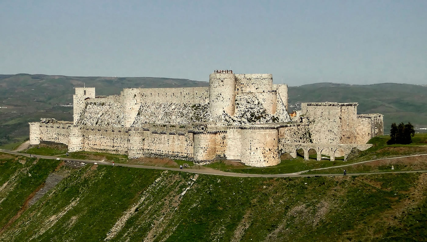 Krak des Chevaliers, Arabic: قلعة الحصن, romanized: Qalʿat al-Ḥiṣn also called Hisn al-Akrad (Arabic: حصن الأكراد, romanized: Ḥiṣn al-Akrād, lit. 'Fortress of the Kurds') and formerly Crac de l'Ospital; Krak des Chevaliers or Crac des Chevaliers (French pronunciation: [kʁak de ʃ(ə)valje]), is a medieval castle in Syria and one of the most important preserved medieval castles in the world. The site was first inhabited in the 11th century by Kurdish troops garrisoned there by the Mirdasids. In 1142 it was given by Raymond II, Count of Tripoli, to the order of the Knights Hospitaller. It remained in their possession until it fell in 1271. The Hospitallers began rebuilding the castle in the 1140s and were finished by 1170 when an earthquake damaged the castle. The order controlled a number of castles along the border of the County of Tripoli, a state founded after the First Crusade. Krak des Chevaliers was among the most important, and acted as a center of administration as well as a military base. After a second phase of building was undertaken in the 13th century, Krak des Chevaliers became a concentric castle. This phase created the outer wall and gave the castle its current appearance. The first half of the century has been described as Krak des Chevaliers' "golden age". At its peak, Krak des Chevaliers housed a garrison of around 2,000. Such a large garrison allowed the Hospitallers to exact tribute from a wide area. From the 1250s the fortunes of the Knights Hospitaller took a turn for the worse and in 1271 Mamluk Sultan Baibars captured Krak des Chevaliers after a siege lasting 36 days, supposedly by way of a forged letter purportedly from the Hospitallers' Grand Master that caused the Knights to surrender. Renewed interest in Crusader castles in the 19th century led to the investigation of Krak des Chevaliers, and architectural plans were drawn up. In the late 19th or early 20th century a settlement had been created within the castle, causing damage to its fabric. The 500 inhabitants were moved in 1933 and the castle was given over to the French Alawite State, which carried out a program of clearing and restoration. When Syria declared independence in 1946, it assumed control. Today, the village of al-Husn exists around the castle and has a population of nearly 9,000. Krak des Chevaliers is approximately 40 kilometres (25 mi) west of the city of Homs, close to the border of Lebanon, and is administratively part of the Homs Governorate. Since 2006, the castles of Krak des Chevaliers and Qal'at Salah El-Din have been recognised by UNESCO as World Heritage Sites. It was partially damaged in the Syrian civil war from shelling and recaptured by the Syrian government forces in 2014. Since then, reconstruction and conservation work on the site had begun. Reports by UNESCO and the Syrian government on the state of the site are produced yearly. |