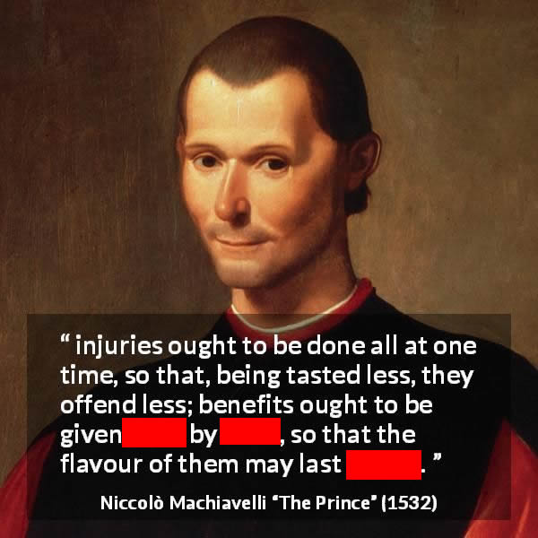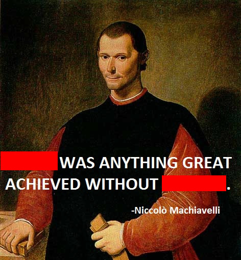 Know Your Quotations! Niccolò di Bernardo dei Machiavelli For many years he served as a senior official in the Florentine Republic with responsibilities in diplomatic and military affairs. He wrote comedies, carnival songs, and poetry. His personal correspondence is of high importance to historians and scholars. He worked as secretary to the Second Chancery of the Republic of Florence from 1498 to 1512, when the Medici were out of power. Machiavelli's name came to evoke unscrupulous acts of the sort he advised most famously in The Prince. Machiavelli considered political battles, not through a lens of morality, but as though they are a board game with established rules. His experience showed him that politics have always been played with deception, treachery and crime. He also notably said that a ruler who is establishing a kingdom or a republic, and is criticized for his deeds, including violence, should be excused when the intention and the result is beneficial. Machiavelli’s Prince was much read as a manuscript long before it was published in 1532 and the reaction was mixed. Some considered it a straightforward description of the evil means used by bad rulers; others read in it evil recommendations to tyrants to help them maintain their power. The term Machiavellian often connotes political deceit, deviousness, and realpolitik. Even though Machiavelli has become most famous for his work on principalities, scholars also give attention to the exhortations in his other works of political philosophy. While much less well known than The Prince, the Discourses on Livy (composed c. 1517) is often said to have paved the way of modern republicanism. |