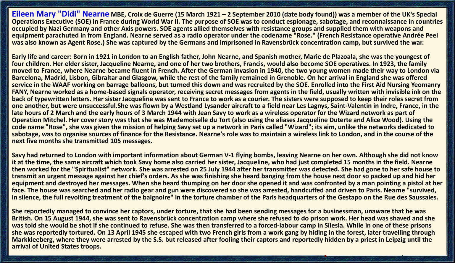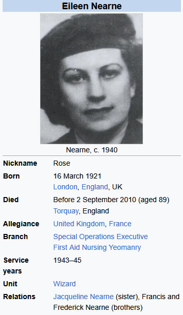 Eileen Mary "Didi" Nearne MBE, Croix de Guerre (15 March 1921[1][2] – 2 September 2010 (date body found)) was a member of the UK's Special Operations Executive (SOE) in France during World War II. The purpose of SOE was to conduct espionage, sabotage, and reconnaissance in countries occupied by Nazi Germany and other Axis powers. SOE agents allied themselves with resistance groups and supplied them with weapons and equipment parachuted in from England. Nearne served as a radio operator under the codename "Rose." (French Resistance operative Andrée Peel was also known as Agent Rose.) She was captured by the Germans and imprisoned in Ravensbrück concentration camp, but survived the war. Early life and career: Born in 1921 in London to an English father, John Nearne, and Spanish mother, Marie de Plazoala, she was the youngest of four children. Her elder sister, Jacqueline Nearne, and one of her two brothers, Francis, would also become SOE operatives. In 1923, the family moved to France, where Nearne became fluent in French After the German invasion in 1940, the two young women made their way to London via Barcelona, Madrid, Lisbon, Gibraltar and Glasgow, while the rest of the family remained in Grenoble. On her arrival in England she was offered service in the WAAF working on barrage balloons, but turned this down and was recruited by the SOE. Enrolled into the First Aid Nursing Yeomanry FANY, Nearne worked as a home-based signals operator, receiving secret messages from agents in the field, usually written with invisible ink on the back of typewritten letters. Her sister Jacqueline was sent to France to work as a courier. The sisters were supposed to keep their roles secret from one another, but were unsuccessful. The year was 1944, and the stakes for the Allied forces could not have been higher as the preparations for D-Day reached fever pitch. In this atmosphere of high-tension espionage, twenty-three-year-old Eileen Nearne stepped forward to volunteer for Britain’s Special Operations Executive (SOE). Her assignment was arguably the most suicidal role in the field: a wireless operator in Nazi-occupied France. At the time, the average life expectancy for a radio operator in the field was a harrowing six weeks. The German forces utilized advanced direction-finding equipment - mobile units that cruised through French streets like sharks, hunting for the specific electronic pulse of a clandestine transmission. Once a signal was intercepted, the Gestapo could triangulate a location within minutes, and the penalty for operating a wireless was immediate execution. Eileen was an unlikely candidate for such a grim profession. Having fled France with her family during the initial Nazi invasion, she arrived in Britain as a quiet, unassuming young woman. When she applied for the SOE, recruiters were initially skeptical; she appeared fragile, reserved, and almost too ordinary for the psychological rigors of undercover warfare. However, her superiors soon realized that her lack of a "soldierly" presence was her greatest weapon. She could blend into a crowd, disappear into a village, and look a German officer in the eye without triggering the slightest suspicion. In March 1944, she parachuted into the darkness of occupied France under the alias "Rose," carrying little more than her radio, forged identity papers, and an iron-willed sense of duty. For the next four months, Eileen became the invisible heartbeat of the French Resistance. She operated in a state of constant, low-level terror, setting up her heavy radio equipment in damp attics, forgotten basements, and abandoned farmhouses. Her task was to transmit coordinates for weapon drops, intelligence on German troop movements, and confirmations of sabotage missions that would eventually cripple the Nazi response to the Allied invasion. Every time she keyed her transmitter, she was essentially screaming her location to the enemy. She had to remain perfectly calm, encoding and decoding complex ciphers with meticulous accuracy while straining to hear the sound of German trucks pulling up outside her window. In July 1944, the inevitable happened: the Gestapo closed in. Eileen was arrested during a sweep of her network, but the Nazis did not initially realize they had captured the prized wireless operator. They subjected the five-foot-tall, 100-pound woman to a series of interrogations that would have broken the strongest men. They used the "baignoire" - a horrific waterboarding technique - along with beatings and psychological torment. Despite the agony, Eileen never surrendered her secrets. She leaned into her "ordinary" persona, insisting she was a simple, naive French saleswoman who had been tricked into helping people she didn't know. Her performance was so convincing, and her silence so absolute, that the Gestapo eventually concluded she was a mere bystander. This act of supreme deception saved the lives of dozens of agents and allowed the Resistance network to continue its work, though Eileen herself was sent to the living hell of the Ravensbrück concentration camp. Eileen’s survival in the camps was a testament to a quiet, stubborn resilience. She endured starvation, forced labor, and the constant threat of the gas chambers, eventually escaping during a forced march in the spring of 1945 as the Third Reich crumbled. When she finally returned to Britain, she was a ghost of her former self, a twenty-four-year-old who had witnessed the worst of humanity. Although she was awarded the MBE and the Croix de Guerre, her work was immediately swallowed by the Official Secrets Act. She was forbidden from discussing her missions, and so she simply stopped talking. For the next sixty-five years, Eileen lived a life of extreme privacy in the seaside town of Torquay. She never married, never had children, and never sought the spotlight. Her neighbors knew her only as a polite, solitary woman who walked her dog and lived modestly on a small pension. When