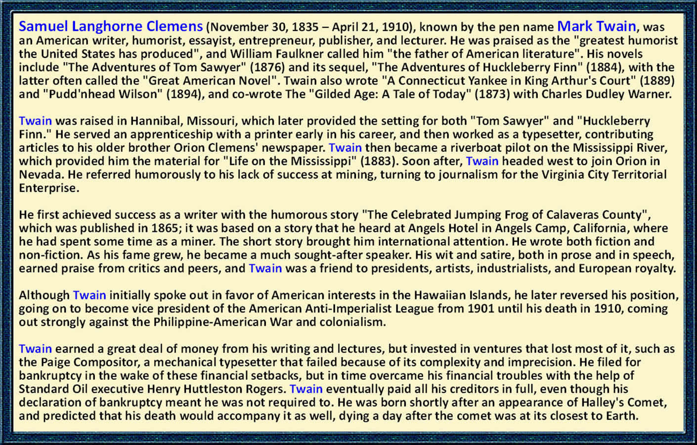 On April 21, 1910—one day after Halley's Comet reached its brightest point—Mark Twain died.