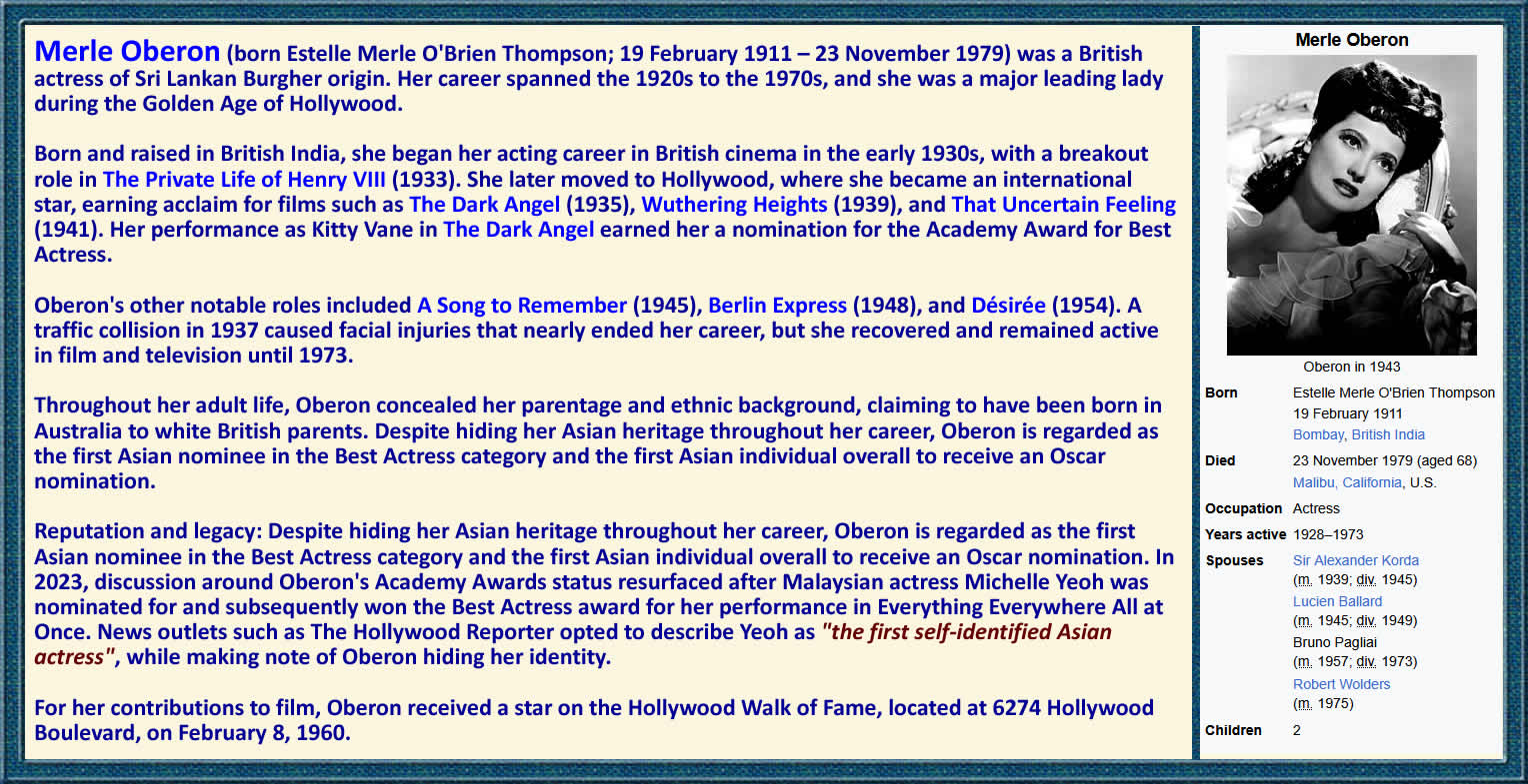 Merle Oberon told everyone she was British: born in Tasmania to white parents, that a tragic fire