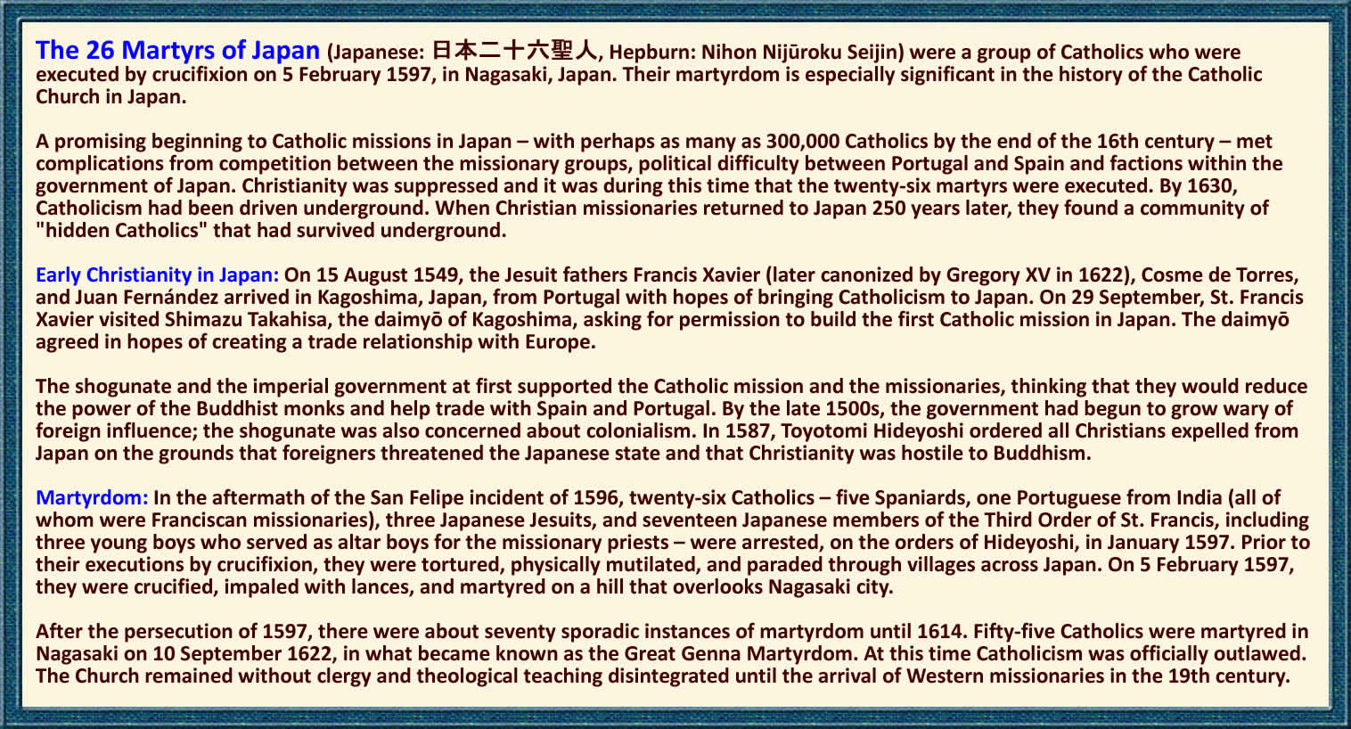 The “26 Martyrs of Japan” were crucified on February 5, 1597. In 1543 the first Christian missionaries arrived in Japan—Portuguese Catholics. With a few decades the religion was thriving in Japan, with hundreds of thousands of converts. Fearful of the growing influence of the faith, and of the perception that Christians placed loyalty to Christ above loyalty to the Shogunate, in 1587 Shogun Toyotomi Hideyoshi banned propagation of Christianity, declaring that Shintoism and Buddhism were the only permissible religions in Japan. Enforcement of the degree was lackadaisical, however, and Christian missionaries continued to arrive and were generally tolerated—until an incident in 1596 sparked severe persecution. In late 1596 the Spanish ship San Felipe was shipwrecked on the coast of Japan, carrying a cargo worth over a million pesos. When the local Japanese authorities began confiscating the ship’s cargo, the Spanish captain protested and the matter was sent to Hideyoshi for resolution, in the capital city of Kyoto. While the negotiations were ongoing, one of the Japanese commissioners, Mashita Nagamori, befriended some of the Spanish crew. When he asked one of the ship’s officers to tell him more about his country, the officer pulled out a map of the world and proudly showed Nagamori the extent of the Spanish empire. He also insinuated that the way Spain grew its empire was by first infiltrating foreign populations and converting them to Christianity, then later conquering them. Nagamori reported the conversation to Hideyoshi, who interpreted it as confirmation of his fear that Christian missionaries were part of plot to take over his country. He immediately ordered that the immediate arrest of Christian leaders in Kyoto. Twenty-six Christians—four Spaniards, one Mexican, one Portuguese Indian, and twenty Japanese, were arrested. To intimidate the Christian population, the arrested men were forced to march from Kyoto to Nagasaki (600 miles). Once there, all twenty-six were tortured and crucified. They were killed with lances while hanging on their crosses. Following the “San Felipe Incident” and the execution of the missionaries, all Christian churches in Japan were destroyed, and practice of the Christian faith was made punishable by death. For centuries, suspected Christians were required to step on an image of Christ or the Virgin Mary (something the Japanese authorities believed no believer would do). Over the next 250 years, hundreds more Christians and missionaries were tortured and executed in Japan, many of whom were subsequently canonized. The persecution of the Church finally ended with the Meiji Restoration in 1868. During the time that Christianity was illegal and Christians were being persecuted, the faith survived in Japan, being kept alive by Kakure Kirishitan, “Hidden Christians.” When the persecution ended, over 20,000 “Hidden Christians” revealed themselves. In 1862 the “26 Martyrs of Japan” were canonized by Pope Pius IX. In Nagasaki today there is a Twenty-Six Martyrs Museum and Monument, erected in 1962. |