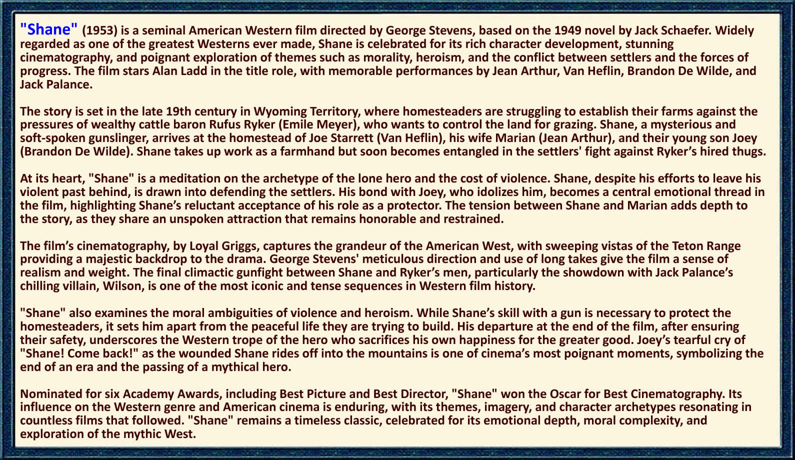 "Shane", directed by George Stevens and released in 1953, is widely regarded as one of the greatest Westerns ever made. The film stars Alan Ladd as Shane, a mysterious gunslinger who attempts to settle into a peaceful life with a Wyoming homesteading family led by Van Heflin and Jean Arthur. Conflict arises when ruthless cattle barons threaten their land, forcing Shane to confront his violent past. The film’s cinematography captured the grandeur of the American West, while its themes explored the cost of violence, the myth of the lone hero, and the fragile hope of community. Brandon deWilde delivered a memorable performance as the young boy who idolizes Shane, adding emotional resonance to the story. Upon release, "Shane" was a critical and commercial success, winning an Academy Award for Best Cinematography and earning several other nominations, including Best Picture. Its climactic showdown and poignant farewell became iconic moments in film history. Over the decades, "Shane" influenced countless Westerns and remains a touchstone for the genre. Its enduring legacy lies in its blend of action, morality, and melancholy, securing its place as an American cinematic masterpiece. |