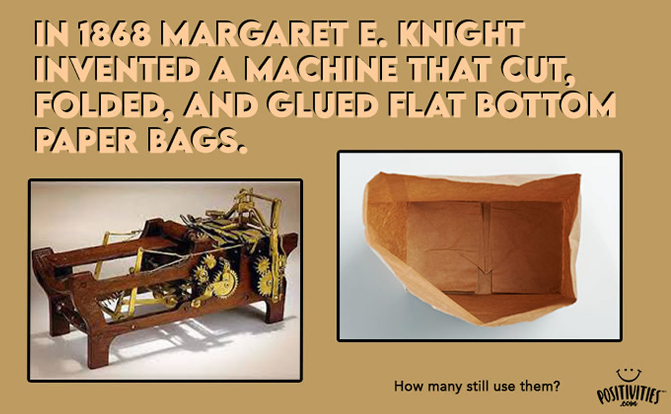 In 1867, while employed at the Columbia Paper Bag Company, she found her life’s invention. The factory made useless, flimsy envelope-like bags. Flat-bottom bags existed, but workers had to fold each one by hand: slow, costly, ridiculous.