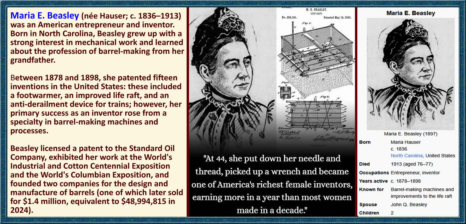 | Maria Beasley - c. 1836–1913): At 44, she put down her needle and thread, picked up a wrench - and became one of America's richest female inventors, earning more in a year than most women made in a decade.