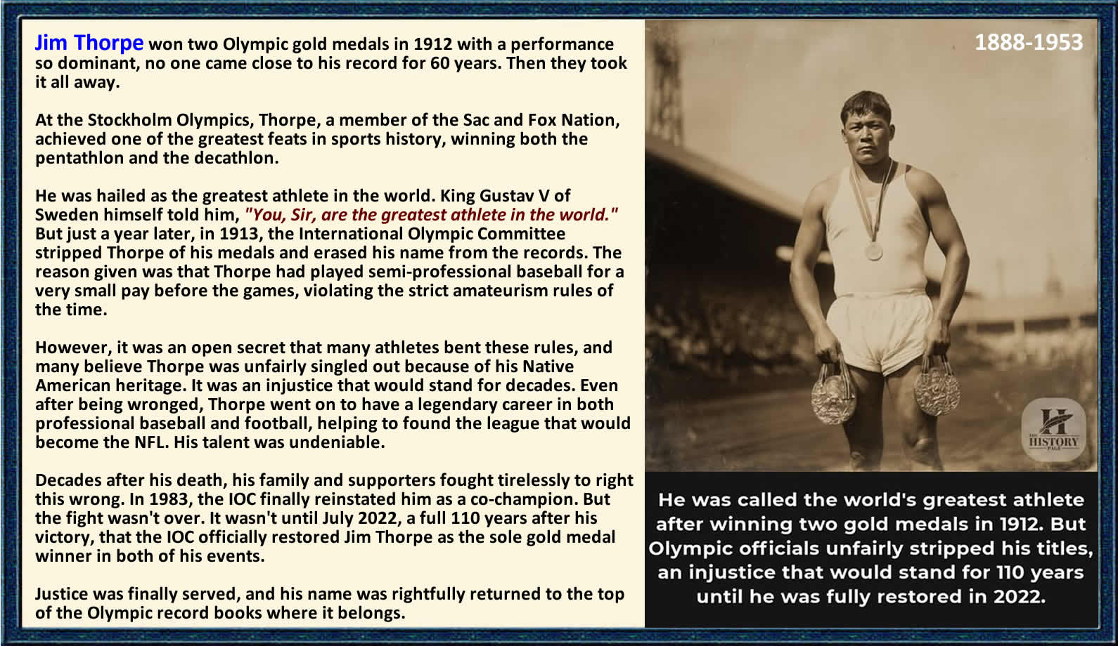 Stockholm, Sweden - summer 1912 - the Olympics. Jim Thorpe was representing the United States in track and field. He was competing in the pentathlon and decathlon: grueling multi-event competitions that tested every athletic skill: running, jumping, throwing, endurance, speed, strength.The decathlon alone took three days and ten events. It was designed to find the world's greatest all-around athlete. Jim Thorpe didn't just win. He demolished the competition. In the decathlon, he finished first, beating the second-place finisher by nearly 700 points - a margin so enormous it would stand for decades. In the pentathlon, he dominated similarly, winning by massive margins in multiple events. When it was over, King Gustaf V of Sweden presented Jim with his gold medals. The King reportedly said: "Sir, you are the greatest athlete in the world." Jim's response was characteristically modest: "Thanks, King." The American press went wild. Jim Thorpe returned home to a ticker-tape parade down Broadway in New York City. His name was in every newspaper. He was the pride of the nation, proof of American athletic superiority. For a Native American man from the Sac and Fox Nation who'd grown up in poverty on a reservation, who'd been sent to boarding schools designed to "kill the Indian, save the man," who'd faced discrimination his entire life - this was a moment of vindication. Jim Thorpe was the greatest athlete in the world. The King of Sweden had said so. The Olympic records proved it. Then, in January 1913 - just six months after his Olympic triumph - a newspaper published a story. Jim Thorpe had played semi-professional baseball in 1909 and 1910, earning about $2 per game while playing in the minor leagues. Under Olympic rules of that era, athletes had to be pure amateurs. Accepting any money for any sport - even yearsearlier, even tiny amounts - meant you weren't eligible. The Amateur Athletic Union launched an investigation. The International Olympic Committee got involved. The verdict came swiftly. Jim Thorpe's Olympic medals were stripped, his records were erased, his name was removed from the Olympic record books as if he'd never competed at all. The gold medals he'd won? Handed to the second and third-place finishers. The greatest athletic performance in Olympic history up to that point? Officially, it never happened. Jim was devastated. He wrote a letter trying to explain: he'd played baseball innocently, not knowing it would affect his amateur status. Other athletes had done the same but used fake names to hide it. Jim had used his real name because he didn't think he was doing anything wrong. It didn't matter. The decision stood. Here's what makes this particularly cruel: many Olympic athletes of that era were wealthy men whose families could support them while they trained full-time. They could afford to be "amateurs" because they didn't need the money. Jim Thorpe was poor. He'd grown up on a reservation. Playing baseball for $2 a game had helped him survive, not made him rich. And while wealthy white athletes competed in the Olympics with financial support from their families, Jim Thorpe - who'd needed to earn money to eat - was punished for it.The rules were designed to exclude people like him. And when he succeeded anyway, they used those same rules to destroy him. Jim tried to move on. He played professional football, helping to establish what would become the NFL. He played professional baseball in the major leagues. He was extraordinarily talented at everything, but he never recovered from losing his Olympic medals. That moment of validation - standing on the podium, hearing the King of Sweden declare him the world's greatest athlete - had been taken from him. He struggled financially throughout his life. By the 1950s, Jim Thorpe - once the most famous athlete in America - was broke, working odd jobs, barely surviving. In 1950, an Associated Press poll named him the greatest athlete of the first half of the 20th century, but he couldn't pay his rent. On March 28, 1953, Jim Thorpe died of a heart attack in a trailer home in California. He was 64 years old. He died in poverty, still fighting to have his Olympic records restored. His family couldn't afford a proper burial. For three decades, Jim Thorpe remained erased from Olympic history. The record books still showed other names where his should have been. The medals he'd won were in someone else's display cases. Then, in the 1970s and 1980s, people started asking questions. Why was Jim Thorpe still being punished for earning $2 a game to survive, when the rules themselves had been unjust? Why was the greatest athletic performance in Olympic history still officially nonexistent? In 1982, the International Olympic Committee admitted the 1913 decision had been wrong. They announced they would restore Jim's medals. On January 18, 1983 - exactly 70 years after his medals were stripped - the IOC presented duplicate gold medals to Jim Thorpe's family.Thirty years after his death, Jim Thorpe was finally, officially, recognized again as the 1912 Olympic pentathlon and decathlon champion. The King of Sweden had been right in 1912: Jim Thorpe was the greatest athlete in the world. It just took 71 years and Jim's death for the Olympic establishment to admit it.Think about what was taken from him: not just medals - though those mattered. Not just records - though those mattered too.They took his moment, his validation, his proof that a poor Native American kid from a reservation could be the greatest in the world at something. They let him die in poverty while his Olympic achievements were officially erased. And they only gave it back when he couldn't hold the medals himself, couldn't see his name restored to the record books, couldn't stand on a podium one more time as the champion he'd always been. Jim Thorpe dominated the 1912 Olympics so thoroughly that decades passed before anyone matched his margins of victory. He was so good that the Kin