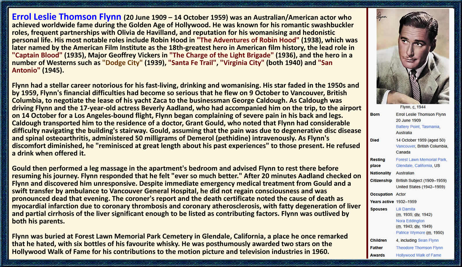 Errol Flynn’s love life was always front and center in Hollywood’s gossip columns. With his irresistible charm and matinee-idol looks, Flynn wasn’t just a sensation on the screen - his off-screen romances and scandals were just as captivating. His whirlwind relationships and notorious behaviour made him both a legendary star and a figure of constant controversy. After his divorce, Flynn’s reputation as a notorious ladies’ man only grew. He was romantically linked to a number of actresses and socialites, but in 1943, he surprised many by marrying Nora Eddington, a 19-year-old he met during one of his most publicized legal battles. Flynn was on trial for statutory rape, a charge that threatened to end his career, but Nora stood by him throughout. Their relationship was short but passionate. They had two daughters, Deirdre in 1945 and Rory in 1947. Despite forming a family, their marriage couldn’t withstand Flynn’s reckless lifestyle and constant affairs. The pressure of fame and his unpredictable behavior ultimately led to their divorce in 1949. That same year, Flynn married actress Patrice Wymore. Younger and optimistic, Patrice hoped to settle down with the iconic actor. They had one daughter together, Arnella Flynn, born in 1953. But like his previous marriages, this one faced constant challenges. Flynn’s charm continued to attract women, and his string of extramarital affairs never really stopped. Even as his film roles began to slow down, he remained a favorite subject in gossip columns - often for his romantic escapades rather than his acting. Flynn’s love life was also deeply affected by his drinking. Known for his hard-partying ways, his dependency on alcohol created tension and turmoil in all his relationships. Yet, there was something magnetic about him. Despite his flaws, his wives and lovers often found it hard to walk away, drawn in by his wit, charisma, and undeniable presence. One of the most defining scandals of Flynn’s life was the early 1940s trial where he faced statutory rape charges. Though he was acquitted, the case added fuel to his bad-boy image. The trial, with its dramatic courtroom scenes and media frenzy, made it harder for his partners to trust him, and it placed even more strain on already fragile relationships. By the 1950s, Flynn’s star had started to fade, and so had his health. Seeking a quieter life, he relocated to Europe, but his lifestyle didn’t slow down. He continued to drink heavily, chase women - often decades younger - and live fast. His romantic escapades remained a frequent topic of conversation, even as his film work diminished. Flynn’s final and most controversial relationship was with Beverly Aadland, a teenage actress who stayed with him during his final years. The significant age gap drew public outrage, but Flynn, true to form, seemed unfazed. The two traveled extensively, and he even spoke of marrying her. Despite the scandal, Beverly was with him until the end. Errol Flynn died on October 14, 1959, at the age of 50. He was in Vancouver, Canada, when he suffered a massive heart attack during a business trip. Years of heavy drinking, smoking, and relentless living had caught up with him. His death shocked Hollywood, but in a way, it felt like a fitting end to a life lived at full throttle. Doctors who examined him reported that his body showed the wear of someone far older, a sobering testament to the excesses that defined his legendary - and turbulent - life. |