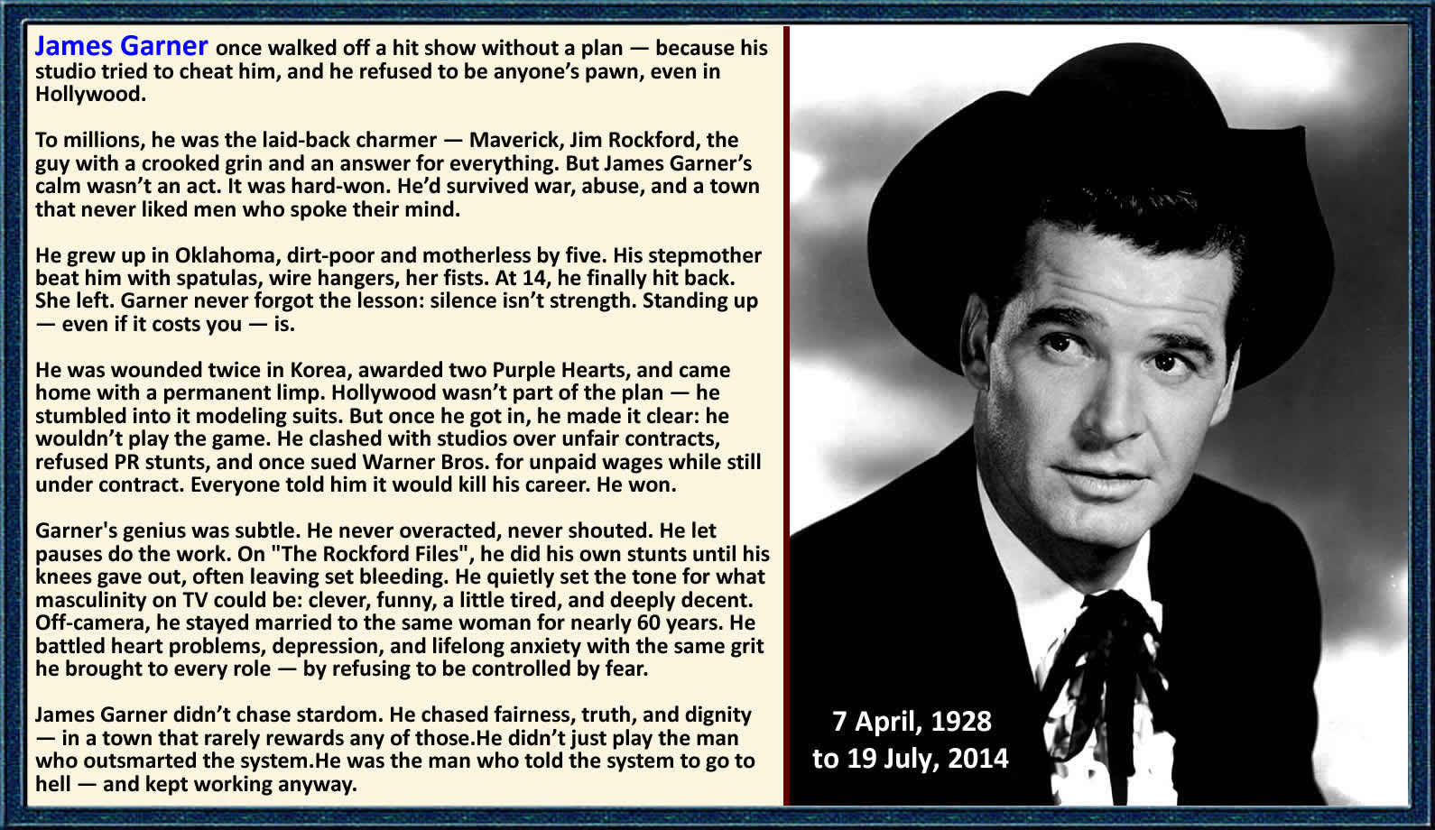 James Scott Garner (né Bumgarner; April 7, 1928 – July 19, 2014) was an American actor. He played leading roles in more than 50 theatrical films, which included The Great Escape (1963) with Steve McQueen; Paddy Chayefsky's The Americanization of Emily (1964) with Julie Andrews; Cash McCall (1960) with Natalie Wood; The Wheeler Dealers (1963) with Lee Remick; Darby's Rangers (1958) with Stuart Whitman; Roald Dahl's 36 Hours (1965) with Eva Marie Saint; as a Formula 1 racing star in Grand Prix (1966); Raymond Chandler's Marlowe (1969) with Bruce Lee; Support Your Local Sheriff! (1969) with Walter Brennan; Blake Edwards's Victor/Victoria (1982) with Julie Andrews; and Murphy's Romance (1985) with Sally Field, for which he received an Academy Award nomination. He also starred in several television series, including popular roles such as Bret Maverick in the ABC 1950s Western series Maverick and as Jim Rockford in the NBC 1970s private detective show, The Rockford Files. Garner's career and popularity continued into the 21st century with films such as Space Cowboys (2000) with Clint Eastwood; the animated film Atlantis: The Lost Empire (2001) (voice work) with Michael J. Fox and Cree Summer; The Notebook (2004) with Gena Rowlands and Ryan Gosling; and in his TV sitcom role as Jim Egan in 8 Simple Rules (2003–2005). Military service Garner enlisted in the California Army National Guard, serving his first 7 months in California. He was deployed to Korea during the Korean War, and spent 14 months as a rifleman in the 5th Regimental Combat Team, then part of the 24th Infantry Division. He was wounded twice: in the face and hand by fragmentation from a mortar round, and in the buttocks by friendly fire from U.S. fighter jets as he dove into a foxhole. Garner would later joke that "there was a lot of room involving my rear end. How could they miss?" Garner received the Purple Heart in Korea for his initial wounding. He also qualified for a second Purple Heart (for which he was eligible, since he was hit by friendly fire which "was released with the full intent of inflicting damage or destroying enemy troops or equipment"), but did not actually receive it until 1983, 32 years after the event. This was apparently the result of an error which was not rectified until Garner appeared on Good Morning America in November 1982, with presenter David Hartman making inquiries "after he learned of the case on his television show". At the ceremony where he received his second Purple Heart, Garner understated: "After 32 years, it's better to receive this now than posthumously". Reflecting on his military service, Garner recalled: "Do I have fond memories? I guess if you get together with some buddies it's fond. But it really wasn't. It was cold and hard. I was one of the lucky ones." |